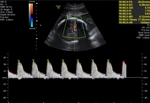 בדיקת מהירות הזרימה בעורק המוח האמצעי MCA, מנבאת די טוב את האפשרות כי קיימת אנמיה עוברית. מצב אשר לעיתים מצריך עירוי דם תוך רחמי לעובר על מנת להציל את חייו. בדיקה זו חשובה במיוחד לנשים הרות אשר פיתחו נוגדני דם מסוגים שונים.